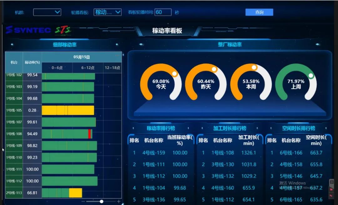 設備稼動率看板 當天每臺設備的稼動率,綠色表示加工中,橘紅色表示閑置,灰色表示關(guān)機或斷線,紅色表示報警。 當日、昨天、本周上周稼動率 同上圖需要數(shù)據(jù)采集盒