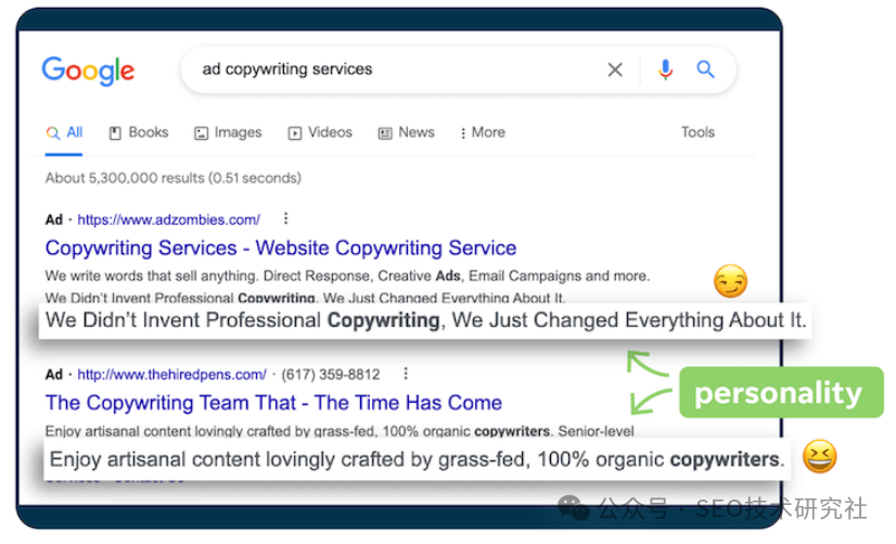 廣告內(nèi)容由于您的質(zhì)量得分和出價(jià)策略會(huì)受到廣告內(nèi)容的影響,因此您選擇的文案和圖片是 PPC 的重要組成部分。 有很多方法可以?xún)?yōu)化 PPC 廣告并提高您贏得出價(jià)和獲得點(diǎn)擊的機(jī)會(huì)。簡(jiǎn)而言之,您需要確保您的廣告與出價(jià)關(guān)鍵字的意圖相匹配,并確保它們?cè)趽頂D的搜索頁(yè)面上脫穎而出。