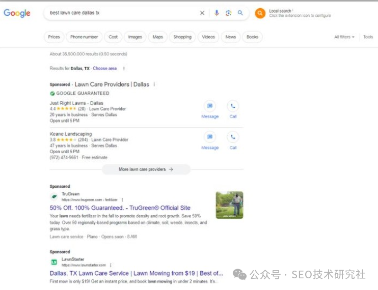 那是因?yàn)檫@些搜索者現(xiàn)在不一定想聘請(qǐng)園藝師。因此,如果您花錢(qián)通過(guò) PPC 廣告獲得這些點(diǎn)擊,就很難賺回您的錢(qián)。SEO 是這些信息關(guān)鍵詞的最佳選擇。 讓我們翻轉(zhuǎn)一下,看看“best lawn care Dallas TX”的結(jié)果。