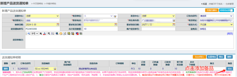 :點晴ERP-新增送貨單如何增加備品發(fā)貨![]() 點擊進入 如下圖: