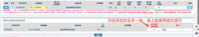 點擊添加后會多一條,填上數(shù)量再提交退可 如下圖:
