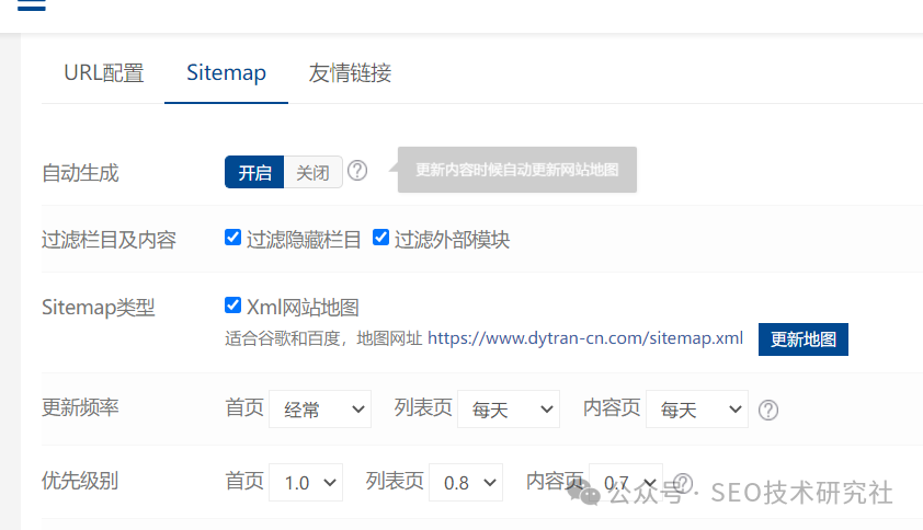 2,網(wǎng)站CMS管理后臺SEO配置以eyoucms網(wǎng)站程序為例,強大的SEO功能可以生成sitemap網(wǎng)站地圖,結合實時推送有利于SEO提交頁面收錄效率。如下圖: