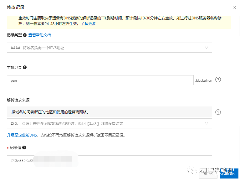 配置域名因?yàn)閕pv6地址較難記憶,因此我們可以利用域名進(jìn)行解析。這里以阿里云為例。