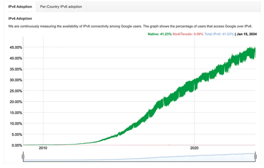 IPv6 的出現(xiàn)無(wú)疑是一件好事,然而根據(jù)谷歌的統(tǒng)計(jì),截至 2024年1月15日,IPv6 引入十多年來(lái),互聯(lián)網(wǎng)用戶使用 IPv6 的占比還沒(méi)有達(dá)到 50%,僅僅是 41.23%。