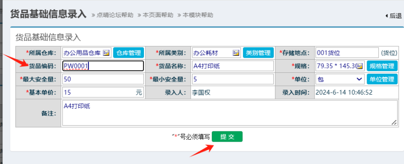 然后修改內容,(編碼一定要改,不能重復),修改完最后提交,就會新增一個類似的貨品信息,