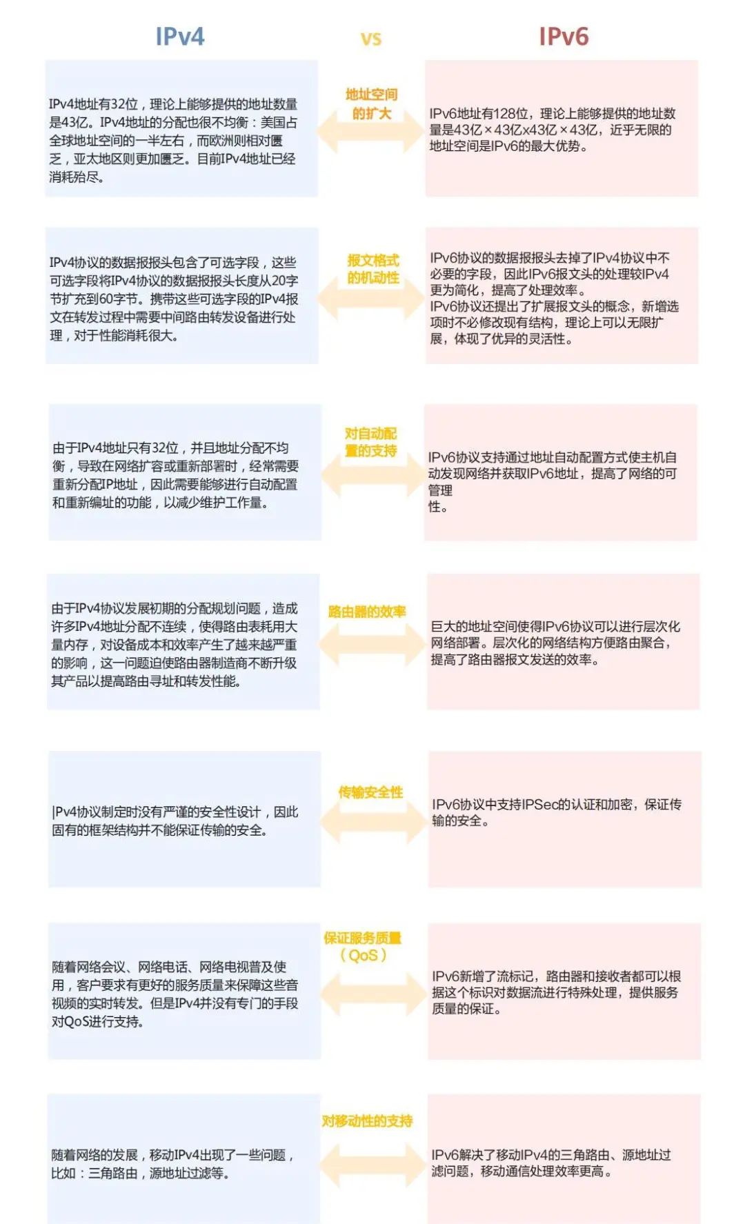 IPv6 作為全球公認(rèn)的下一代互聯(lián)網(wǎng)商業(yè)應(yīng)用解決方案,為解決 IPv4 地址枯竭而制定的下一代互聯(lián)網(wǎng)協(xié)議版本。 今年年初,因 IPv4 將耗盡,巨頭企業(yè)宣布收費(fèi)后,IT行業(yè)內(nèi)對 IPv6 的發(fā)展尤為關(guān)注,網(wǎng)絡(luò)工程師們也不例外。 雖然知道 IPv6 有二十多年,但一直以來對它的理解僅停留在“為了解決 IPv4 地址空間不足而設(shè)計的一個過度工程化的解決方案”。 最近,Sedat Kapanoglu深入研究了 IPv6 的工作原理,發(fā)現(xiàn)其中有不少有趣的知識可以和你分享。 今天就來嘮嘮,不知道你對IPv6怎么看? 我一直對IPv6這個名字感到困惑,因為我覺得IPv4名字來源于它用來表示32位的四個字節(jié),所以IPv6應(yīng)該被稱為IP16。 但實(shí)際上,這只是協(xié)議的版本號。 在IPv4推出之前,曾存在過IPv1、IPv2和IPv3,它們主要用于內(nèi)部研究IP協(xié)議,后來被我們現(xiàn)在的IPv4所取代。 在上世紀(jì)80年代,還提出過IPv5的提案,旨在優(yōu)化實(shí)時通信,但大家發(fā)現(xiàn)IPv6能解決地址空間問題后,該提案就被放棄了,因此才有了IPv6這個名字,代表互聯(lián)網(wǎng)協(xié)議第6版。 后來有人嘗試創(chuàng)建IPv7、IPv8等更高版本,但它們要么已被廢棄,要么被擱置起來。 和IPv4一樣,IPv6有自身的尋址方案,但它使用的是128位地址而非IPv4的32位地址。 ![]() 這兩種協(xié)議之間的差異不僅體現(xiàn)在地址空間大小上,而且與IPv4對比,IPv6有其獨(dú)特特性,比如: 01 IPv6沒有子網(wǎng)掩碼 IPv6和IPv4同樣支持CIDR(無類別域間路由),但從用戶角度看,IPv6地址要簡單得多:前半部分是全球互聯(lián)網(wǎng)地址,后半部分是本地地址。這是推薦的IPv6地址使用方式。當(dāng)你訪問某個顯示IP地址的網(wǎng)站如WhatismyipWhatever時,它會顯示出你的IPv6地址形式如下: 1111:2222:3333:4444:5555:6666:7777:8888 但是,你的互聯(lián)網(wǎng)服務(wù)提供商(ISP)只知道你的前綴部分為1111:2222:3333:4444,并將這個/64的地址塊分配給你。地址的剩余部分對你的網(wǎng)絡(luò)中的每一臺設(shè)備都是獨(dú)一無二的。ISP只會將所有以1111:2222:3333:4444開頭的數(shù)據(jù)包轉(zhuǎn)發(fā)至你的路由器,然后路由器會將數(shù)據(jù)包進(jìn)一步傳遞到目標(biāo)設(shè)備。因此,地址的后半部分(5555:6666:7777:8888),我們可以稱之為INTERFACE_ID,這部分對于你的設(shè)備來說是唯一的。這就意味著你擁有的每一臺設(shè)備都擁有一個獨(dú)特的IPv6地址,可以從世界任何地方單獨(dú)訪問,原因在于: 02 IPv6 不使用 NAT 技術(shù) 實(shí)際上,針對 IPv6 的 NAT(Network Address Translation,是指網(wǎng)絡(luò)地址轉(zhuǎn)換) 并不存在公開的標(biāo)準(zhǔn)規(guī)范。雖然有一個名為 NAT66 的草案提議,但至今并未轉(zhuǎn)化為現(xiàn)實(shí)標(biāo)準(zhǔn)。 之所以在 IPv6 中不需要 NAT,是因為理論上地球的每個設(shè)備都可以有一個獨(dú)立的全球可訪問的地址。 開始我對此感到很奇怪,因為在玩網(wǎng)絡(luò)游戲時雖然我們常常痛恨 NAT 導(dǎo)致的種種不便,但它卻給人一種安全感,除非你明確通過 UPnP 或端口轉(zhuǎn)發(fā)允許,否則你的本地設(shè)備永遠(yuǎn)不會被外部網(wǎng)絡(luò)直接訪問。 有一個殘酷的事實(shí)是,NAT 并不是一道安全屏障,它只是一個替代的數(shù)據(jù)包轉(zhuǎn)發(fā)機(jī)制。 在默認(rèn)情況下,你的IPv6路由器本不應(yīng)隨意將來自外部的連接嘗試轉(zhuǎn)發(fā)給本地設(shè)備。 因此,在 IPv6 環(huán)境下,即便不使用 NAT,你也同樣可以獲得相同級別的安全保障。 實(shí)際上,借助IPv6地址,你無需經(jīng)過路由器,或者不必另行配置VPN,就能直接訪問本地網(wǎng)絡(luò)上的每一臺設(shè)備:只需要進(jìn)行身份驗證即可。 盡管IPv6為每臺設(shè)備分配獨(dú)立的IPv6地址帶來了便利,但也存在一個與安全相關(guān)的問題:由于每個設(shè)備都有獨(dú)一無二的地址,因此它們可以被個別識別和跟蹤,這對我們的隱私保護(hù)構(gòu)成威脅。 為此,現(xiàn)代操作系統(tǒng)引入了臨時IPv6地址的概念,該地址的INTERFACE_ID會定期變化。 這樣一來,你可以使用永久IPv6地址接收外部的連接請求,而在建立連接時,對外展示的是一個頻繁變動的二級臨時地址作為你的IPv6地址。 03 IPv6地址具備自動配置功能 IPv6協(xié)議無需依賴DHCP(Dynamic Host Configuration Protocol,動態(tài)主機(jī)設(shè)置協(xié)議)服務(wù)器或手動網(wǎng)絡(luò)配置來確定IP地址、子網(wǎng)掩碼及網(wǎng)關(guān)地址。一臺設(shè)備可以不通過詢問中央服務(wù)器而自主獲取IP地址。 這一過程是通過一個名為SLAAC(Stateless Address Autoconfiguration,無狀態(tài)地址自動配置)的協(xié)議實(shí)現(xiàn)的,具體步驟如下: