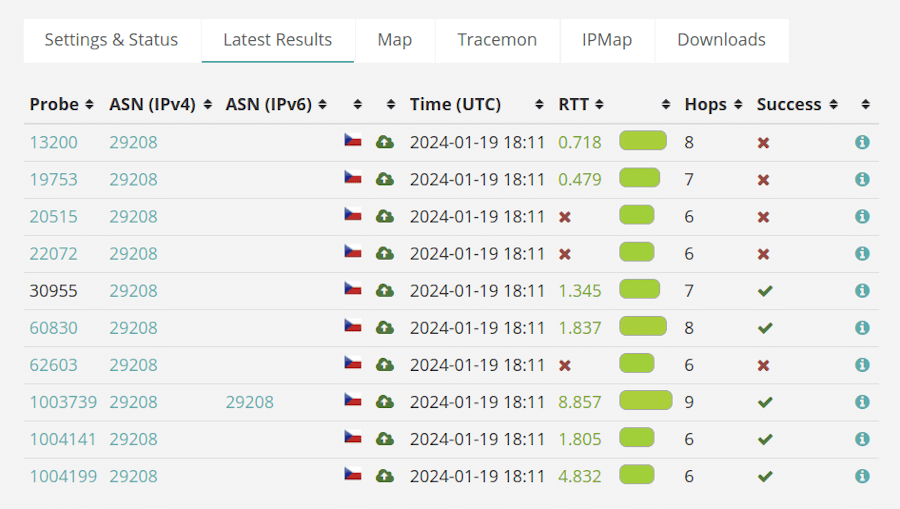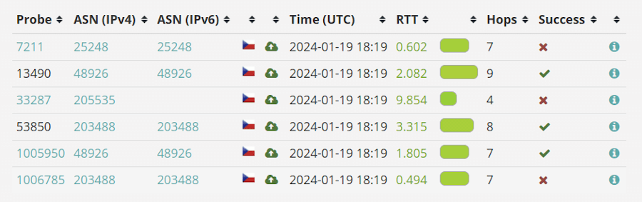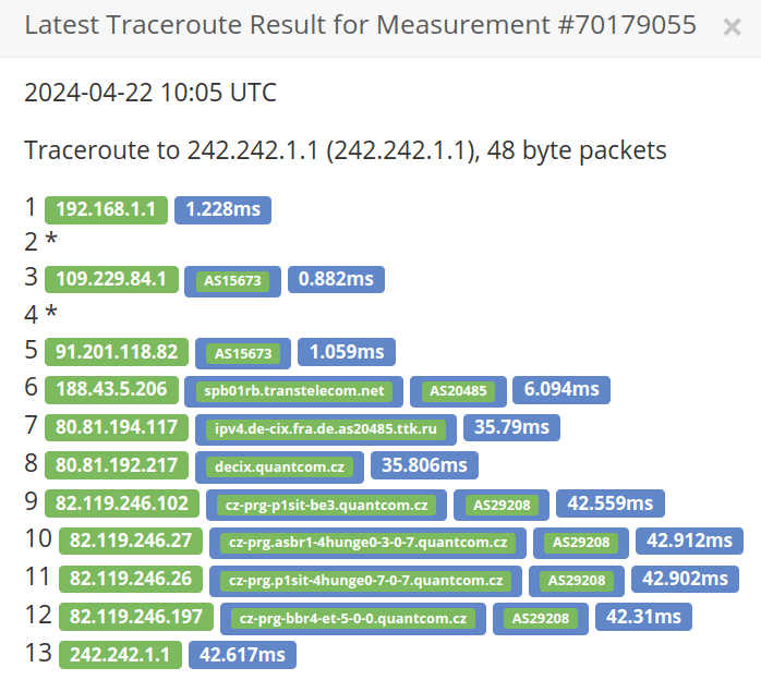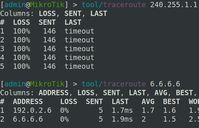 一些路由器供應商可以直接設置E類地址,而有一些則需特殊配置。例如,JunOS需要在配置中設置routing-options martians 240/4 orlonger allow,然后才能設置這些地址;與之類似,Arista EOS需要在配置中設置use ipv4 routable 240.0.0.0/4,才能接受E類地址。 還有一些供應商的接口則堅決拒絕設置E類地址。 還有一個問題是,在使用E類CIDR時,動態(tài)路由協(xié)議是否能正確運行?答案:有時可以。 然而,如果你計劃在環(huán)境中部署此類地址空間,那么在使用OSPF/IS-IS等協(xié)議時,需要注意一些非常棘手的問題。 OSPF 的一些意外情況 在下面的例子中,假設我們有兩個路由,一個支持將E類空間安裝到數(shù)據(jù)(轉(zhuǎn)發(fā))平面中,另一個(諾基亞)則不支持。然而,由于OSPF的工作方式,路由將通過諾基亞路由器傳遞,就好像諾基亞可以路由這些地址,但由于諾基亞從未安裝這些路由,因此可能丟棄或使用默認路由來傳輸流量。 如果讓MikroTik跟蹤路由到位于諾基亞路由器后面的E類地址,它會設法將E類地址發(fā)送到諾基亞路由器,但是流量會丟失;而嘗試使用“常規(guī)”的單播地址(例如 6.6.6.6)時,流量會被轉(zhuǎn)發(fā): 這意味著,如果你想在這樣的環(huán)境中部署E類空間,則必須確保路徑中的所有設備(以及可能的備用路徑)都支持E類空間,否則可能會丟失流量。 令人驚訝的真實測試鑒于前面提到的問題,我本以為沒必要進行真實的測試,然而幾天后我收到了互聯(lián)網(wǎng)交換郵件列表的如下電子郵件: 看到這封郵件,我非常驚訝。Quantcom的工作人員決定嘗試使用E類,由于他們的客戶使用了RIPE Atlas探針,我們可以進行“最佳案例”測試,檢查真實的“SOHO”硬件如何處理E類空間: 大約為50%,并不算太糟糕,但距離我們的期望還有很大差距。Quantcom還有使用了RIPE Atlas 探針的BGP下游連接,因此我也做了測試: 結果也是50%!由于大多數(shù)RIPE Atlas硬件都部署在家庭和小型企業(yè)內(nèi)部,因此我們可以預見,如果我們部署了E類空間,則最終設備的最大接受率約為50%。 我聯(lián)系了Quantcom ,他們同意在前面提到的E類空間內(nèi)進行一次IPv4網(wǎng)絡掃描。如此,我們就能夠確定Quantcom的哪些BGP接受了前綴,以及其基礎設施能否路由E類IP地址。 掃描結果為,184,496 個 IP 地址響應了 ping,根據(jù)bgp.tools的地圖數(shù)據(jù),預計在所有網(wǎng)絡前綴中會有380,286,307 個響應,也就是說Quantcom在全部網(wǎng)絡前綴上的測試結果為可達性0.04%。 可達性如此之低,無疑是因為Quantcom只能通過互聯(lián)網(wǎng)交換節(jié)點將測試網(wǎng)絡前綴提供給其下游和直連的BGP對象,因為傳輸提供商和互聯(lián)網(wǎng)交換路由服務器會自動過濾掉這些請求,防止其他網(wǎng)絡知道這個網(wǎng)絡前綴。 接受此網(wǎng)絡前綴的網(wǎng)絡包括: