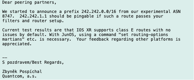 其中一些結果讓我感到有些驚訝,因為這意味著對于使用了這些網(wǎng)絡的地方(有時候還包括它們的供應商),你可以宣布任何東西(也許不包括 RPKI 無效,但不確定),而它們會接受并在其網(wǎng)絡中傳播,包括它們的下游網(wǎng)絡! 對于AS20485 TransTeleKom,184,496個IP中的大部分都能夠響應。我只列出了互聯(lián)網(wǎng)交換點接受了路由的網(wǎng)絡。 在實踐中,我們在BGP過濾方面仍有很長的路要走。如果更多的網(wǎng)絡直接與Quantcom進行對等連接,如果供應商能夠更好地支持這一路由,那么可能會有更多的網(wǎng)絡接受這一路由。 你應該使用E類空間嗎?簡單來說,一般情況下不應該使用。除非你對網(wǎng)絡供應商的決定有超自然的控制,而且無法將所有工作負載遷移到 IPv6。但是,如果你有整個網(wǎng)絡有控制權,那么E類空間在本地/私有尋址方面會提供很大的幫助。 那么,是否全球都可以訪問E類空間?很明顯,E類空間的采用面臨著重重障礙。不僅需要修改10億安裝數(shù)量的用戶軟件,而且還需要在IANA和IETF內(nèi)創(chuàng)建一個政策來改變該空間的用途。 現(xiàn)階段,IETF正在進行的工作不涉及E類空間,我只能假設如果這一提議被接受,那將是一場曠日持久的斗爭。而這也將引發(fā)第二場爭論,即新創(chuàng)建的地址空間應該分配給哪個區(qū)域的RIR。雖然我們有5個RIR,但E空間內(nèi)有8個/8的地址空間可供分配。目前尚不清楚如何分配。 最后,修改軟件是非常困難的,使用E類空間將引發(fā)一系列極其困難的軟件部署挑戰(zhàn)。因為RIR的客戶/成員肯定不愿意接受所有用戶都不適用的地址空間。如果我們打算使用不適用于所有用戶的地址空間,選擇已經(jīng)取得了很大進步并已被接收的地址空間IPv6更為明智。 ———————————————— 版權聲明:本文為博主原創(chuàng)文章,遵循 CC 4.0 BY-SA 版權協(xié)議,轉(zhuǎn)載請附上原文出處鏈接和本聲明。 原文鏈接:https://blog.csdn.net/csdnnews/article/details/139847136 該文章在 2024/6/24 8:38:28 編輯過 |