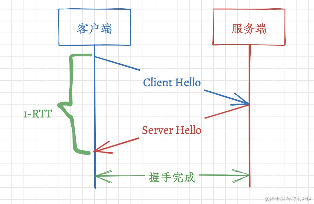 QUIC 協(xié)議不需要三次握手QUIC 建立連接的速度是非??斓?,不需要 TCP 那樣的三次握手,稱之為 0-RTT(零往返時間)及 1-RTT(1次往返時間)。 QUIC 使用了TLS 1.3傳輸層安全協(xié)議,所以 QUIC 傳輸?shù)臄?shù)據(jù)都是加密的,也就是說 HTTP/3 直接就是 HTTPS 的,不存在 HTTP 的非加密版本。 正是因為這樣,所以,QUIC 建立連接的過程就是 TLS 建立連接的過程,如下圖這樣,首次建立連接只需要 1-RTT。