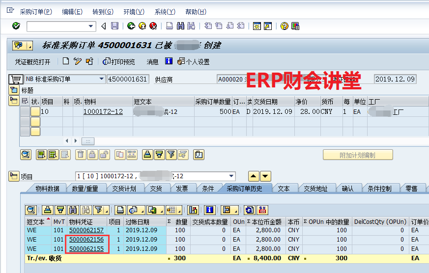 發(fā)票校驗是SAP采購流程中的重要環(huán)節(jié),收到供應(yīng)商發(fā)票之后,需要在SAP中匹配入庫記錄,并核對數(shù)量和金額是否正確,如有差異需要進一步確認原因,必要時將發(fā)票退回給供應(yīng)商。 SAP中發(fā)票校驗可以通過事務(wù)碼MIRO由財務(wù)一步處理,也可以先由業(yè)務(wù)預(yù)制發(fā)票(MIR7),然后財務(wù)審核過賬發(fā)票(MIR4)。本文以MIRO為例,介紹SAP中發(fā)票校驗的具體操作。 系統(tǒng)中有如下采購訂單,數(shù)量為500,訂單收貨3次,每次數(shù)量100,查看采購訂單歷史如下圖。當前收到供應(yīng)商發(fā)票,數(shù)量為200,接下來MIRO進行發(fā)票處理。 ![]() 第一步,匹配入庫憑證。