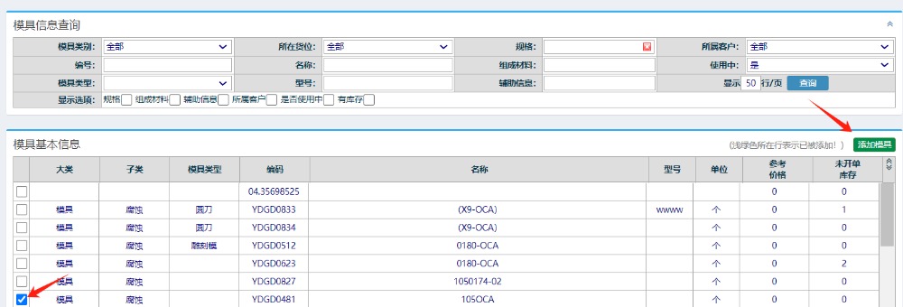 進(jìn)入后,選中對應(yīng)的成品,點(diǎn)擊編輯按鈕 點(diǎn)擊相關(guān)模具號欄位,彈出模具資料挑選界面,如下圖所示: