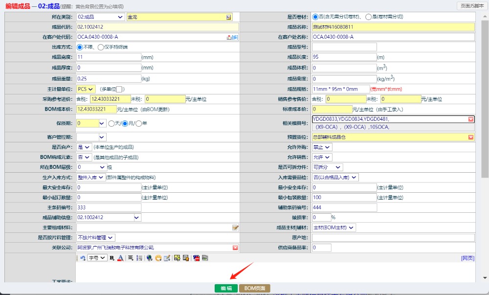 添加完成后,回到界面,點(diǎn)擊編輯按鈕完成操作,如下圖所示: 點(diǎn)晴模切ERP更多信息:http://moqie.clicksun.cn,聯(lián)系電話:4001861886 該文章在 2024/7/2 15:18:29 編輯過 |