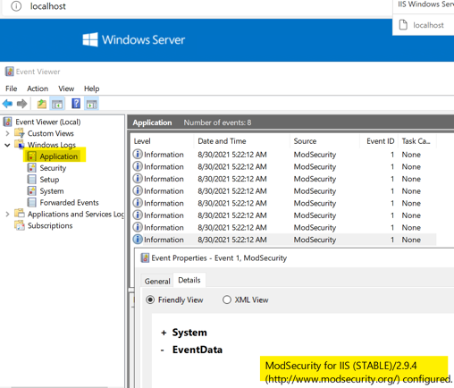 4、重啟IIS,查看事件檢視器中應(yīng)用程式中的ModSecurity 是否有無錯(cuò)誤(如果沒看到,可以直接用Browser 連http://localhost)。