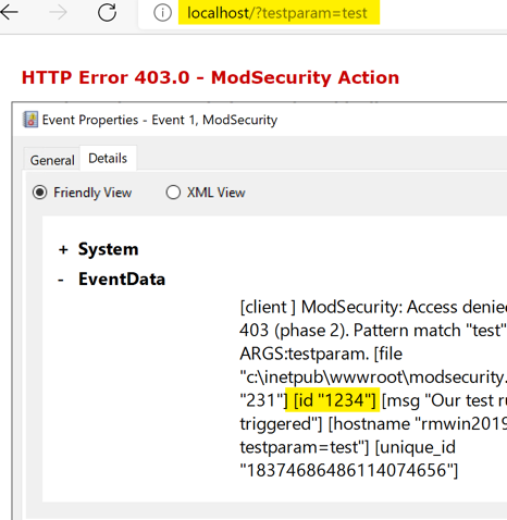 SecRule ARGS:testparam "test" "id:1234,deny,status:403,msg:'Our test rule has triggered'"