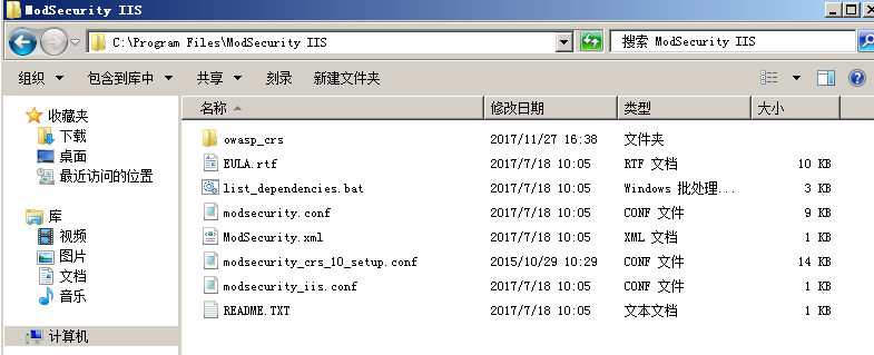 一路Next,保持默認配置完成安裝: 安裝完成以后,在C:\Program Files\ModSecurity IIS 目錄存在如下文件: