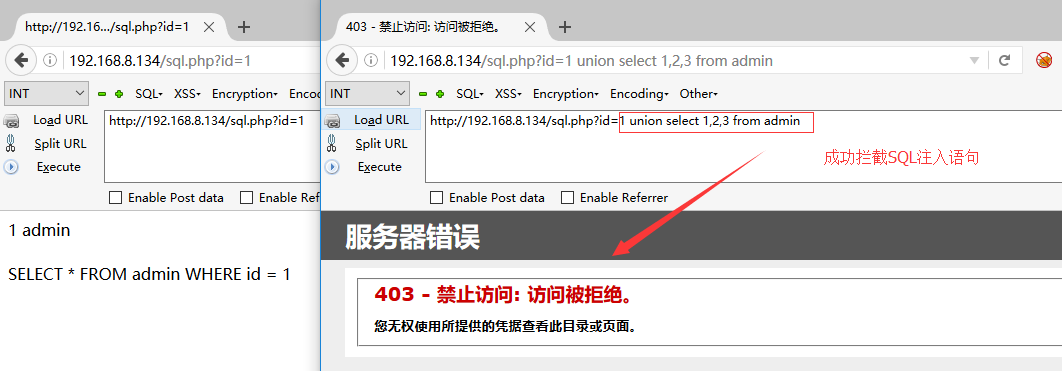 </configuration>如已有web.config配置文件,可在system.webServer節(jié)點增加: <ModSecurity enabled="true" configFile="C:\Program Files\ModSecurity IIS\modsecurity_iis.conf" /> 0x03 效果測試 分別訪問正常頁面與構造SQL注入語句頁面,查看攔截效果: