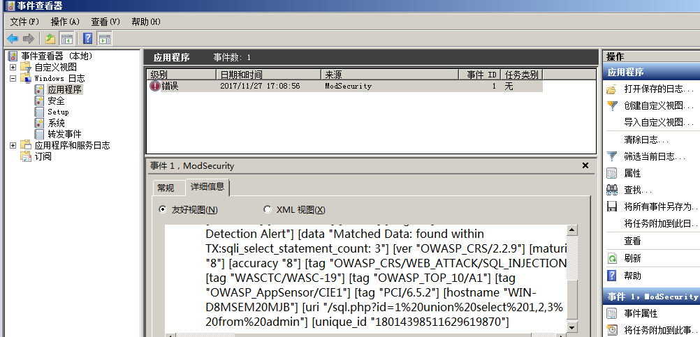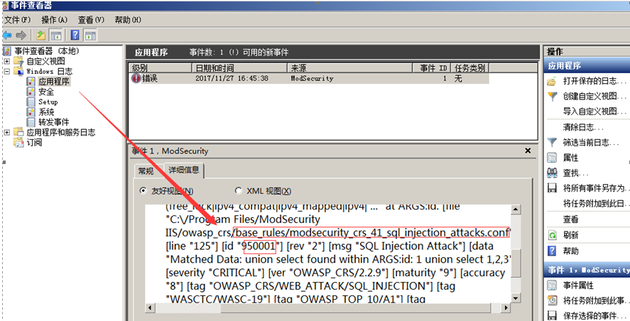 0X04 403錯誤及解決 訪問正常頁面,403錯誤解決方法: 1、打開事件管理器,查看window日志--應用程序,查看攔截日志: 訪問的頁面被規(guī)則誤攔,我們可以去刪除這條規(guī)則來讓頁面恢復正常。在C:\Program Files\ModSecurity IIS\owasp_crs\base_rules\modsecurity_crs_41_sql_injection_attacks.conf中刪除id為950001的規(guī)則。