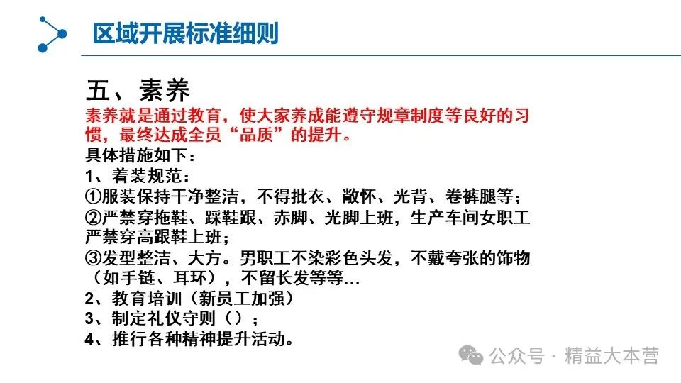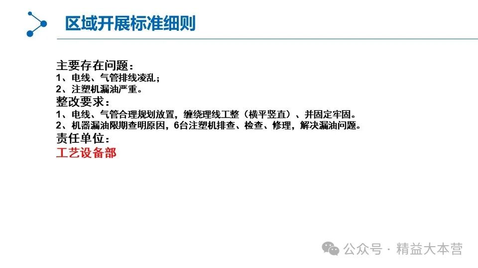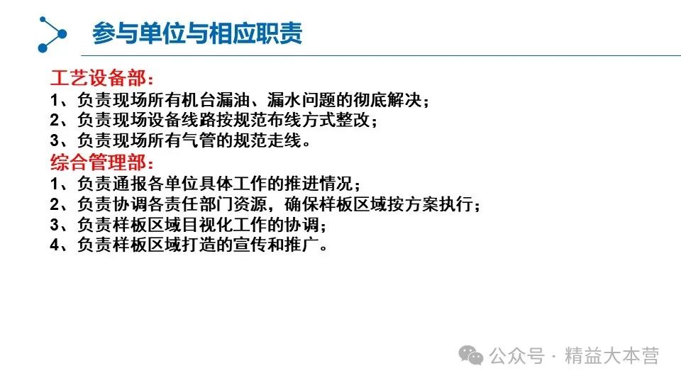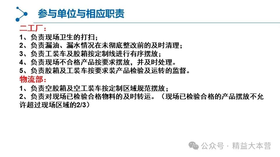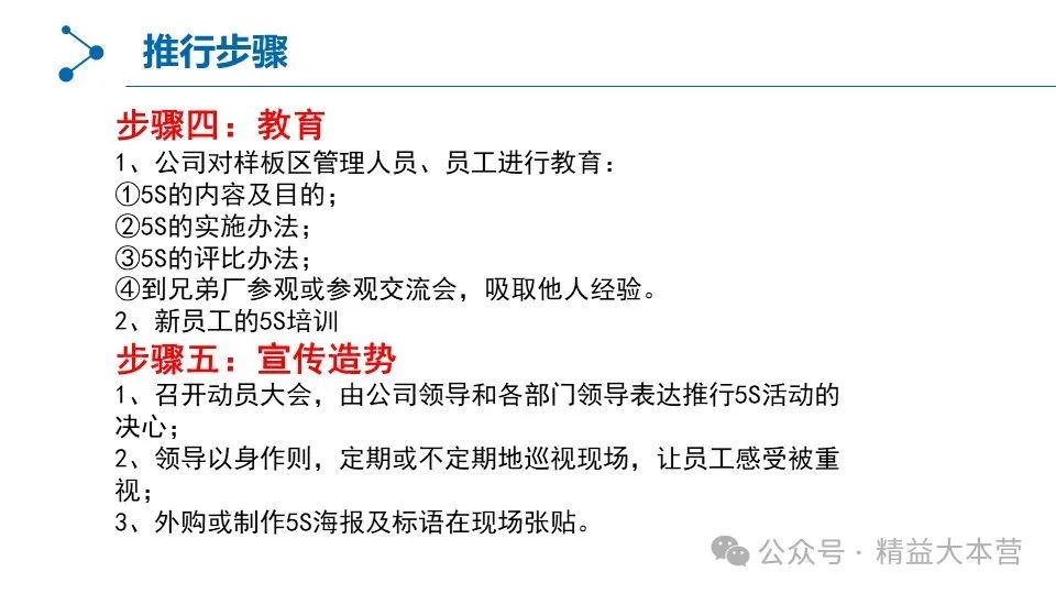 一、意義與目標(biāo) 5S(整理、整頓、清潔、清潔檢查、素養(yǎng))是工廠管理的基礎(chǔ),它強(qiáng)調(diào)通過優(yōu)化現(xiàn)場(chǎng)環(huán)境、提高員工素養(yǎng),達(dá)到提升效率、減少浪費(fèi)、保障安全的目的。工廠5S樣板區(qū)的打造,旨在樹立標(biāo)桿,引導(dǎo)全體員工積極參與5S管理,形成全員參與、持續(xù)改進(jìn)的良好氛圍。通過樣板區(qū)的成功打造,我們期望在工廠內(nèi)形成積極的5S文化氛圍,促進(jìn)工廠整體管理水平的提升。 二、區(qū)域選擇 在選定5S樣板區(qū)時(shí),需綜合考慮以下因素: 1. 區(qū)域代表性:選擇具有代表性的工作區(qū)域,如生產(chǎn)線、倉(cāng)庫(kù)、辦公區(qū)等。 2. 問題暴露性:選擇存在較多5S管理問題的區(qū)域,以便通過整改提升管理效果。 3. 整改可行性:考慮區(qū)域整改的難度和可行性,確保整改工作能夠順利進(jìn)行。 三、推行計(jì)劃 為確保5S樣板區(qū)打造工作有序進(jìn)行,需制定詳細(xì)的推行計(jì)劃: 1 時(shí)間規(guī)劃:明確樣板區(qū)打造的時(shí)間節(jié)點(diǎn),包括啟動(dòng)、實(shí)施、驗(yàn)收和持續(xù)改進(jìn)等階段。 2. 任務(wù)分配:將各項(xiàng)工作任務(wù)分配到具體部門和人員,確保責(zé)任明確。 3. 資源準(zhǔn)備:根據(jù)推行計(jì)劃,提前準(zhǔn)備好所需的物資、設(shè)備等資源。 四、參與單位 5S樣板區(qū)打造工作需要各相關(guān)部門的共同參與和協(xié)作,包括生產(chǎn)部、倉(cāng)儲(chǔ)部、品質(zhì)部、行政部等。各部門需指定專人負(fù)責(zé)5S樣板區(qū)打造工作,確保工作順利進(jìn)行。 五、區(qū)域規(guī)劃 根據(jù)選定的5S樣板區(qū),進(jìn)行詳細(xì)的區(qū)域規(guī)劃: 1. 區(qū)域劃分:根據(jù)工作流程和設(shè)備布局,將區(qū)域劃分為不同的功能區(qū)域。 2. 物品擺放:明確各區(qū)域內(nèi)物品的擺放標(biāo)準(zhǔn)和要求,確保物品擺放整齊、有序。 3. 標(biāo)識(shí)標(biāo)線:在區(qū)域內(nèi)設(shè)置清晰的標(biāo)識(shí)標(biāo)線,方便員工識(shí)別和操作。 六、培訓(xùn)動(dòng)員 為確保5S樣板區(qū)打造工作的順利進(jìn)行,需對(duì)全體員工進(jìn)行5S知識(shí)培訓(xùn)和動(dòng)員: 1. 培訓(xùn)內(nèi)容:包括5S理論、現(xiàn)場(chǎng)管理知識(shí)、安全操作規(guī)范等。 2. 培訓(xùn)方式:采用課堂講授、現(xiàn)場(chǎng)示范、互動(dòng)問答等多種方式,提高培訓(xùn)效果。 3. 動(dòng)員宣傳:通過海報(bào)、宣傳欄、內(nèi)部通訊等多種渠道,宣傳5S樣板區(qū)打造的重要性和意義,激發(fā)員工的積極性和參與熱情。 七、問題記錄 在5S樣板區(qū)打造過程中,需對(duì)發(fā)現(xiàn)的問題進(jìn)行及時(shí)記錄和處理: 1. 問題發(fā)現(xiàn):通過現(xiàn)場(chǎng)巡查、員工反饋等方式,發(fā)現(xiàn)存在的5S管理問題。 2. 問題記錄:將發(fā)現(xiàn)的問題進(jìn)行詳細(xì)記錄,包括問題描述、發(fā)現(xiàn)時(shí)間、責(zé)任部門等。 3. 問題處理:針對(duì)發(fā)現(xiàn)的問題,制定整改措施和時(shí)間節(jié)點(diǎn),確保問題得到及時(shí)有效解決。 八、后期維持 為確保5S樣板區(qū)效果的長(zhǎng)期維持,需建立長(zhǎng)效機(jī)制: 1. 定期檢查:定期對(duì)5S樣板區(qū)進(jìn)行檢查,確保各項(xiàng)標(biāo)準(zhǔn)得到貫徹執(zhí)行。 2. 持續(xù)改進(jìn):根據(jù)檢查結(jié)果和員工反饋,及時(shí)調(diào)整和完善5S管理措施。 3. 宣傳展示:通過現(xiàn)場(chǎng)展示、內(nèi)部交流等方式,展示5S樣板區(qū)的成果和經(jīng)驗(yàn),激勵(lì)其他區(qū)域?qū)W習(xí)和借鑒。 通過以上步驟的實(shí)施,我們相信工廠5S樣板區(qū)打造工作將取得圓滿成功,為工廠管理水平的提升奠定堅(jiān)實(shí)基礎(chǔ)。