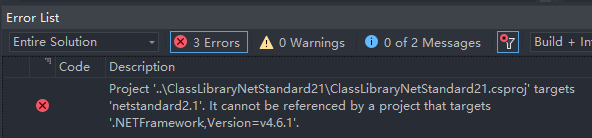 但是,如果我們新建一個(gè).NET Standard 2.1的Class Library,則無法被.NET Framework 4.6.1的項(xiàng)目引用,此時(shí)會(huì)報(bào)錯(cuò):