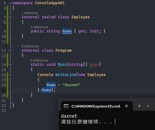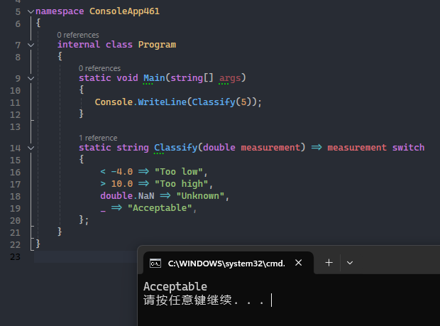 然后,使用C# 9.0中“關(guān)系型模式匹配”新特性編寫一段代碼: