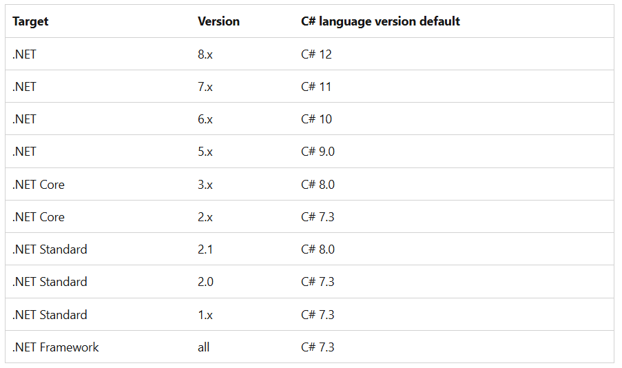 請注意:經(jīng)典.NET Framework最高支持到C# 7.3,C# 8.0是專門面向.NET Core的第一個(gè)主要C#版本,它的一些新功能依賴于新的Core CLR的相關(guān)功能?!?a target="_blank" rel="noopener" style="margin: 0px; padding: 0px; color: rgb(71, 124, 209); text-decoration-line: none;">這篇官方文檔】詳細(xì)列舉了C#語言的發(fā)展歷史以及各個(gè)版本的新功能,下面這張表格列舉了不同.NET版本下,創(chuàng)建新項(xiàng)目時(shí)所使用的默認(rèn)的C#語言版本(參考官方文檔):