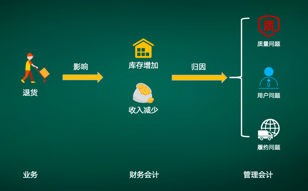 要回答這個問題,我們先來看財務(wù)的組織架構(gòu),分為財務(wù)會計、管理會計兩部分;財務(wù)會計負(fù)責(zé)核算、資金管理、編制財報;管理會計主要負(fù)責(zé)預(yù)算、計劃、管報。再看退貨場景,退貨,會造成庫存增加、成本減少,同時應(yīng)收賬款、收入都會減少;既而管理層需要歸因,分析退貨原因,是質(zhì)量問題,還是用戶大爺任性想退就退?是快遞小哥送貨慢了,還是倉庫發(fā)錯貨?如是質(zhì)量問題,是庫存商品質(zhì)量還是快遞過程損壞?
