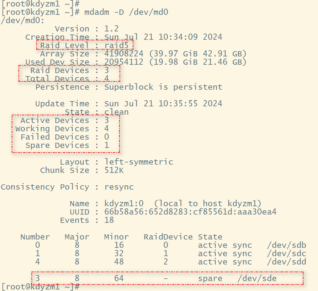 實際上有一種方式,能夠不用關機,不用手動移除,只要有一塊閑置的硬盤,這塊硬盤平時處于閑置狀態(tài),一旦 RAID 磁盤陣列中有硬盤出現(xiàn)故障就會馬上自動頂替上去,并自動完成數(shù)據(jù)恢復,這功能豈不是很棒? 其實只需要初始化磁盤陣列的時候加上 接下來用RAID5為例演示該功能。RAID5要求最少要3塊硬盤,所以我準備了3塊硬盤+1塊備份盤一共四塊硬盤。下圖中的sdb、sdc、sdd、sde一共四塊。 接下來使用這四塊硬盤組raid5