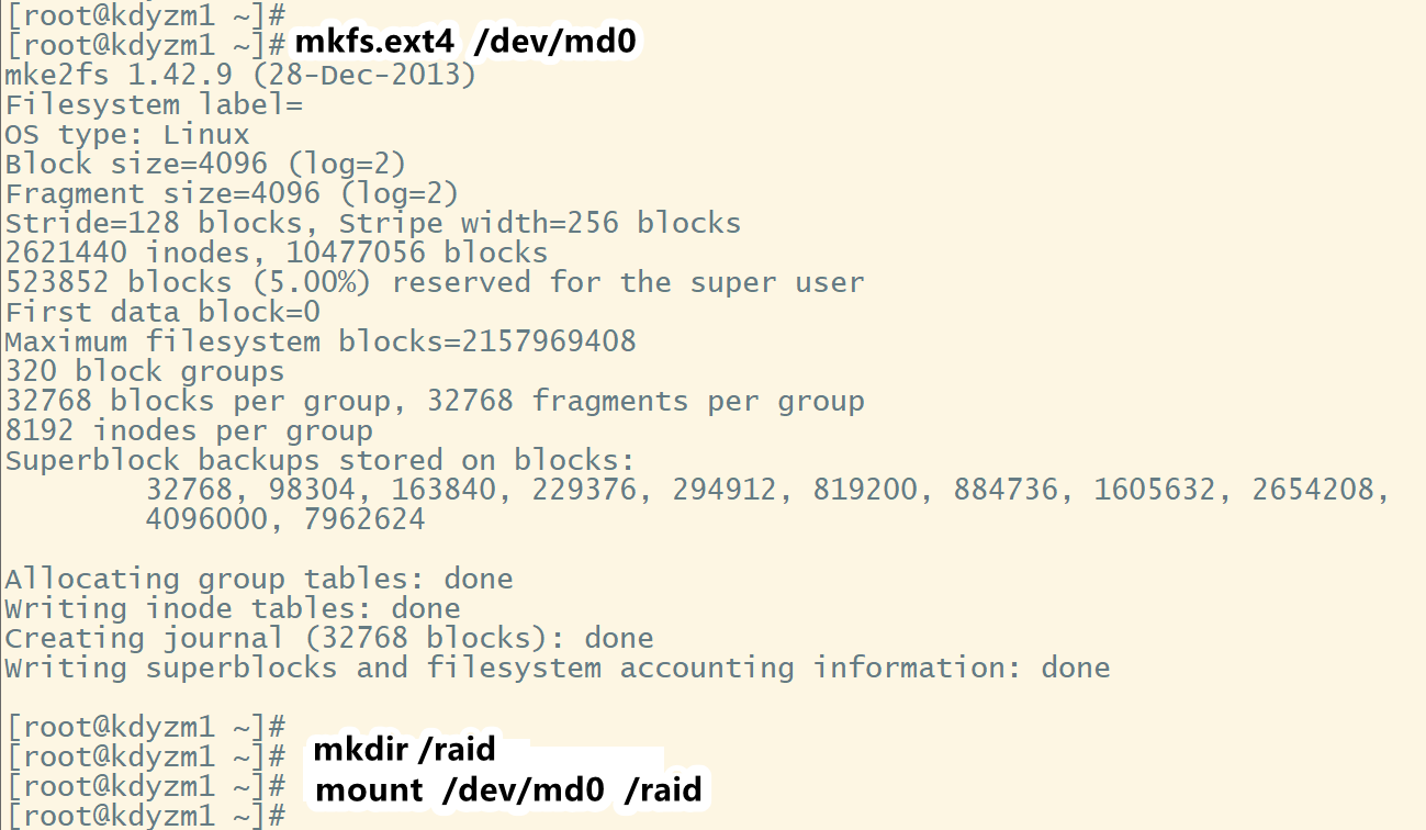 -Cv:創(chuàng)建磁盤陣列并顯示過程 -n 4:該磁盤陣列有4個磁盤 -l 10:創(chuàng)建的磁盤陣列類型是RAID10 一條命令就創(chuàng)建好了RAID10,說真的,我還以為要手動創(chuàng)建若干個RAID1,然后將這些RAID1再用RAID0組合起來呢。 執(zhí)行完該命令后,會有個初始化的過程,大概得一分鐘左右能初始化完成,可以通過 1.2 格式化磁盤陣列創(chuàng)建完磁盤陣列完成后,需要將磁盤陣列格式化之后才能使用,格式化命令還是mkfs命令