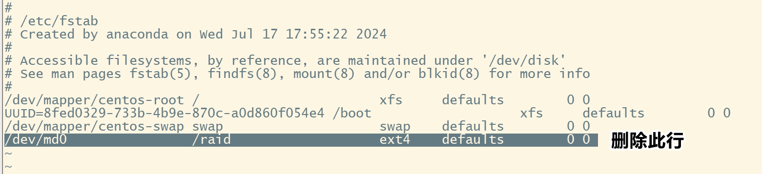 接下來,馬上運行命令 可以看到備份硬盤/dev/sde已經(jīng)自動頂上去并開始初始化了,再過一會兒,在查詢下md0磁盤陣列 可以看到/dev/sde已經(jīng)完全取代了壞掉的/dev/sdb硬盤,并已經(jīng)在正常工作。 4、刪除RAID4.1 取消掛載首先,刪除掉/etc/fstab文件中相關的掛載內(nèi)容 之后,手動取消掛載 4.2 停止磁盤陣列