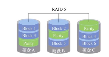 0是偶數(shù),1是基數(shù),它們的異或結(jié)果就是奇偶校驗和。我們把上表中的A和B分別看做一個硬盤,0和1表示硬盤中存儲的數(shù)據(jù),結(jié)果也看做一個硬盤,也就是說,把A和B中的存儲數(shù)據(jù)做了異或運算以后,放到第三個硬盤中;假如還有硬盤C、D、E、F呢?那結(jié)果就是 A異或B異或C異或D異或E異或F 。 這就是RAID5的原理了,但是并不完整,因為根據(jù)校驗和存放的位置不一樣,它會是不同的RAID模式:如果將所有的校驗和都放到一個硬盤中,那這個RAID模式就是RAID3;如果將校驗和分塊存儲到每個硬盤中,那就是RAID5了,可以說RAID5是RAID3的升級版。因為如果校驗和都放到一個硬盤中,那只要存一條數(shù)據(jù),就都要寫一次校驗和到校驗和盤,那這個專門存放校驗和的硬盤肯定容易壞。 在上圖中,Parity就是校驗和塊,每個磁盤都有其余所有磁盤對應塊計算之后的校驗和,這樣就不怕任何一塊磁盤壞掉了,如果有一塊硬盤壞掉,只需要把所有其它盤對應塊的數(shù)據(jù)做一次校驗和,就知道缺失的這塊的數(shù)據(jù)是什么了。這也就解釋了為什么RAID5最少需要3塊硬盤,而且3塊硬盤的容量要一樣。
