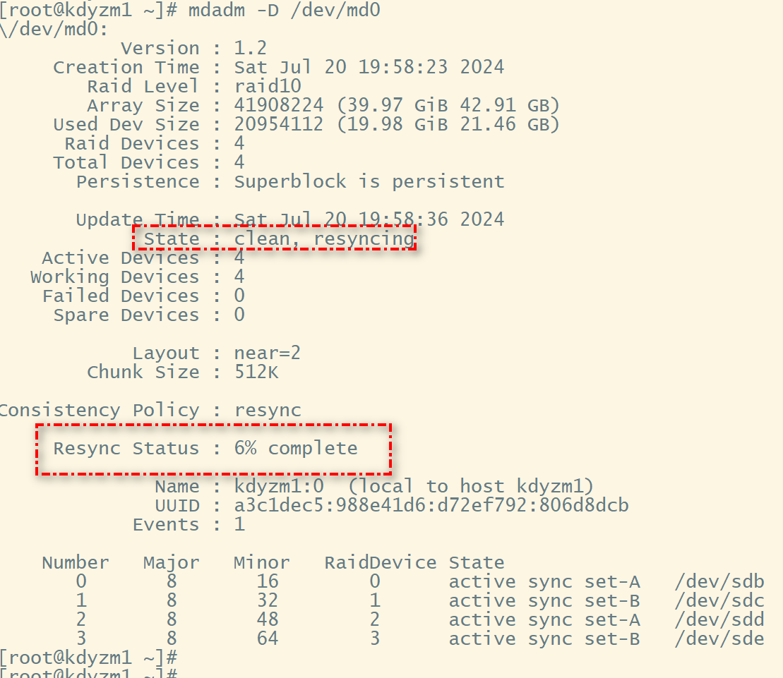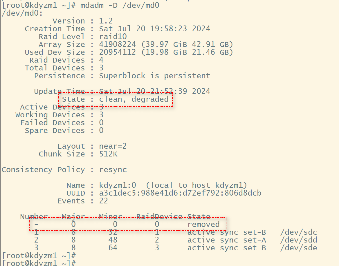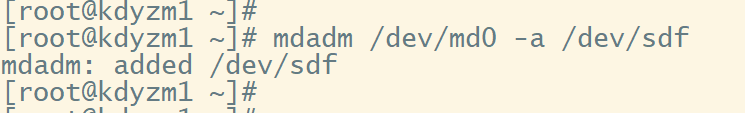 然后看下這個磁盤陣列當前的狀態(tài) 可以看到磁盤陣列狀態(tài)多了個"degraded",表示磁盤陣列降級了,這意味著 RAID 陣列中至少有一個磁盤故障或處于離線狀態(tài),導致陣列無法以完全冗余的方式運行。因為我們移除了/dev/sdb硬盤,所以提示degraded狀態(tài)是正常的。 接下來我們添加一塊新硬盤/dev/sdf,替換掉壞掉的/dev/sdb,使用命令-a將其添加到磁盤陣列中