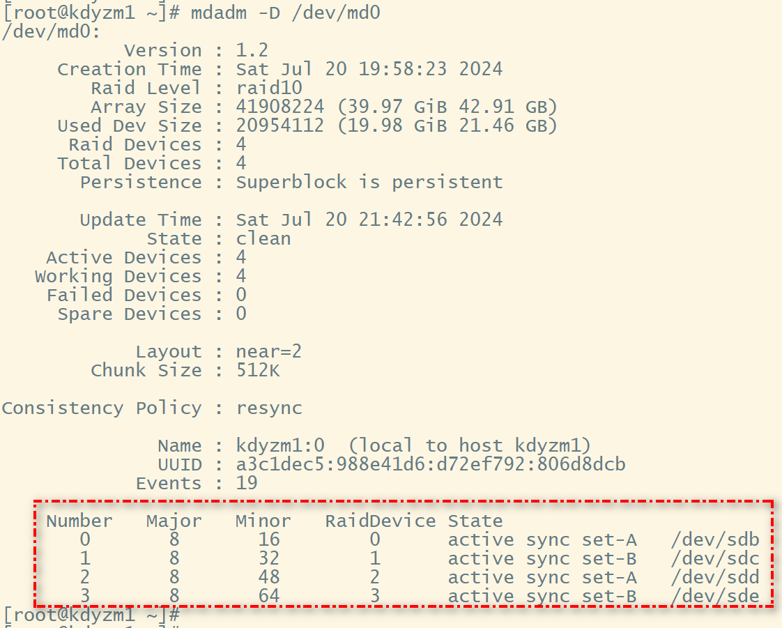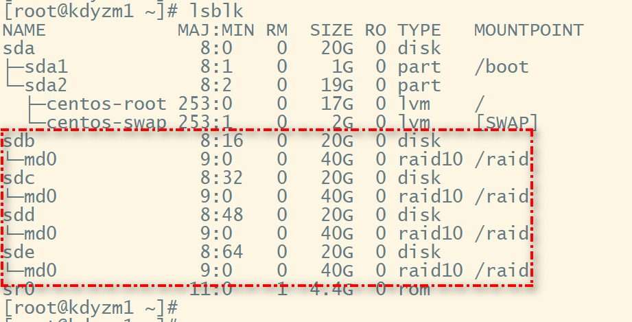 這時候再用 磁盤陣列中的四個磁盤下都有md0分區(qū),而且都是都是raid10類型。 為了永久掛載,還要寫配置文件 1.4 其它RAID模式其它RAID模式是一樣的,只需要改變使用的硬盤數(shù)量和raild類型即可,故不再贅述其它類型的磁盤陣列創(chuàng)建。 2、磁盤損壞和更換在使用磁盤陣列的過程中,不可避免的,總有一天會有硬盤損壞,在RAID10磁盤陣列中,最多同時允許壞掉50%的硬盤,這個容錯率是相當大了,那如果有一塊硬盤損壞了,如何更換這塊壞掉的硬盤呢? 先查詢下我們這個磁盤陣列的詳情