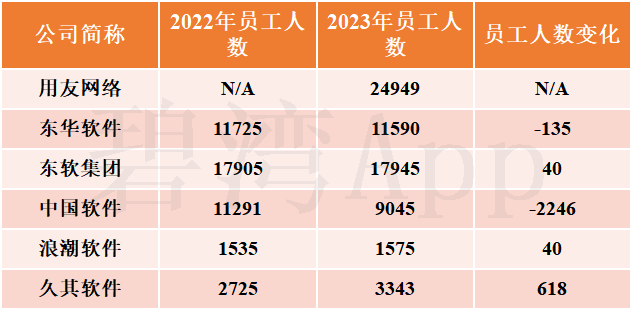 對(duì)比2022年,東軟集團(tuán)、浪潮軟件、久其軟件有所增長(zhǎng)。其中人數(shù)增長(zhǎng)最多的是久其軟件,為618人。中國(guó)軟件、東華軟件有一定程度的下降。