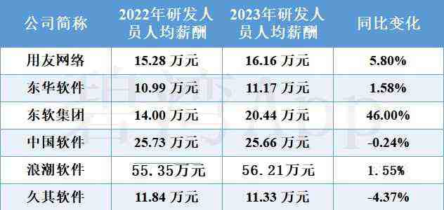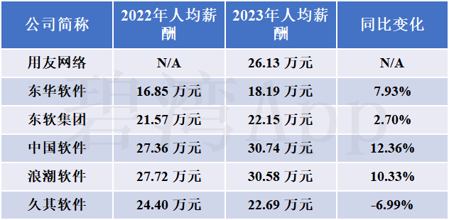 在這6家公司中,用友網(wǎng)絡(luò)是2023年員工數(shù)量最多的的公司,員工總數(shù)為22347人,浪潮軟件最少,為1575人。除此之外東華軟件是2023年技術(shù)人員比率最高的的公司,為總?cè)藬?shù)的85.62%。相反,用友網(wǎng)絡(luò)是2023年技術(shù)人員比率最低的的公司,只有40.05%。
