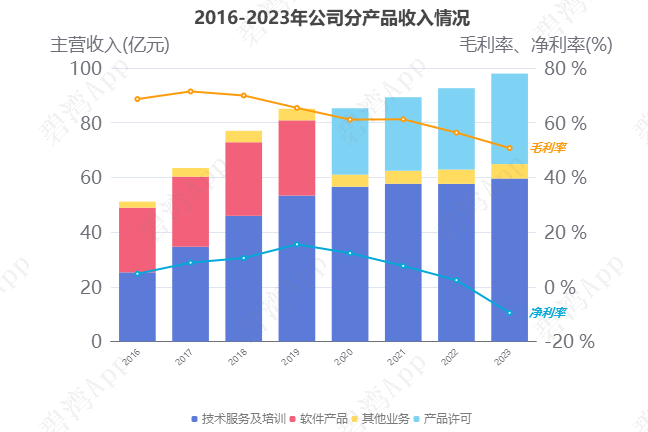 2023年公司的主營(yíng)業(yè)務(wù)為云服務(wù)與軟件業(yè)務(wù),主要產(chǎn)品包括技術(shù)服務(wù)及培訓(xùn)和產(chǎn)品許可兩項(xiàng),其中技術(shù)服務(wù)及培訓(xùn)占比60.83%,產(chǎn)品許可占比33.78%。