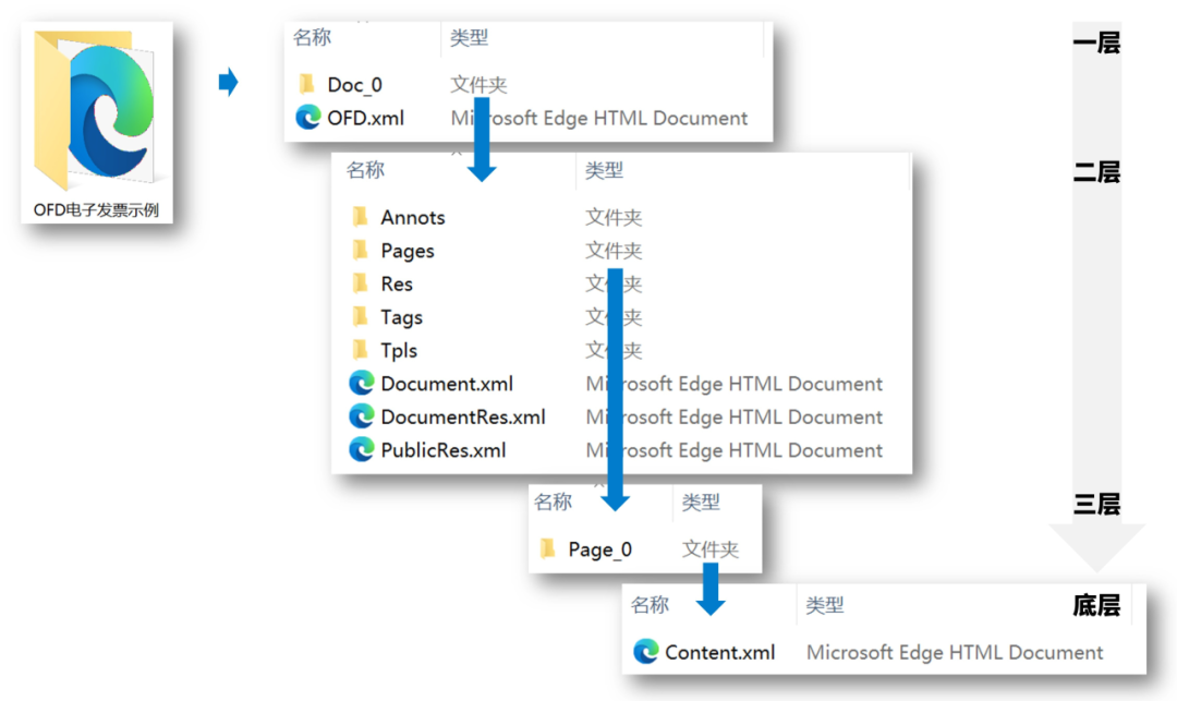 /引言/ OFD(Open Fixed-layout Document)是我國自主研發(fā)的一種版式文檔格式,相比于市場上流行的PDF(Portable Document Format)格式,是一種更自主、更創(chuàng)新、更可靠的選擇。 從國家標(biāo)準(zhǔn)方面看,OFD格式正式開始于《電子文件存儲與交換格式 版式文檔》(GB/T 33190-2016),在此基礎(chǔ)上,根據(jù)電子文件長期保存、自包含、自描述等檔案管理需求,《信息技術(shù) OFD檔案應(yīng)用指南》(GB/T 42133-2022)對OFD進(jìn)一步提出標(biāo)準(zhǔn)化要求。 目前OFD格式在黨政機(jī)關(guān)電子公文歸檔和電子發(fā)票方面應(yīng)用較為廣泛,備受行政辦公、公共事務(wù)辦理等業(yè)務(wù)從業(yè)人員關(guān)注。 下面,筆者以一份電子發(fā)票為例,對OFD文件結(jié)構(gòu)及內(nèi)容進(jìn)行概括性描述,以期幫助非專業(yè)讀者更為具象地認(rèn)識到OFD的獨(dú)特之處。在此基礎(chǔ)上,從OFD文件格式框架“XML+ZIP”出發(fā),進(jìn)一步引導(dǎo)非專業(yè)讀者探知XML(Extensible Markup Language)領(lǐng)域。 01 獲取OFD格式電子發(fā)票 國家稅務(wù)總局電子發(fā)票服務(wù)平臺中,一份電子發(fā)票對應(yīng)了3種格式的電子文件,分別是PDF、OFD、XML,可以直接下載至本地保存。 如果需要對電子發(fā)票進(jìn)行離線閱覽,PDF可以使用通用瀏覽器、國內(nèi)外版式文件閱讀器打開閱覽,OFD可以使用國內(nèi)版式文件閱讀器打開閱覽(如金山WPS等),XML可以使用通用瀏覽器打開閱覽。PDF和OFD顯示一致,呈現(xiàn)為符合通俗習(xí)慣的、易于普通人閱讀理解的書面表格樣式,這也是PDF、OFD被稱之為“版式”格式的主要原因。而XML與前兩者不同,呈現(xiàn)為多層級的結(jié)構(gòu)化數(shù)據(jù)排列樣式,易于機(jī)器解析,相比之下,對于自然人而言,XML的閱讀理解難度遠(yuǎn)遠(yuǎn)大于版式文檔。 02 解壓電子發(fā)票看OFD文件結(jié)構(gòu) 兩步呈現(xiàn)OFD電子發(fā)票的“XML+ZIP” 現(xiàn)代文件格式框架。 # 第一步:解壓。 直接將OFD電子文件后綴名“.ofd”修改為“.ZIP”,便得到一個(gè)ZIP壓縮包,使用解壓工具對壓縮包進(jìn)行解壓,便得到一個(gè)文件夾。 # 第二步:逐層查看文件結(jié)構(gòu)。 進(jìn)入文件夾,便可依次查看各層文件夾和XML文件。 通過上述簡單的兩步操作,可以清晰地感受到OFD現(xiàn)代文件格式框架的涵義,多層文件夾結(jié)構(gòu)顯得既簡煉又清晰,讓人感覺十分干凈。 03 版式呈現(xiàn)內(nèi)容數(shù)據(jù)結(jié)構(gòu)化組織 OFD文件結(jié)構(gòu)打開后,對照GB/T 33190-2016和GB/T 42133-2022,便可進(jìn)一步認(rèn)識各個(gè)文件夾及XML的內(nèi)容及作用。 GB/T 42133-2022給出的OFD文件的包內(nèi)結(jié)構(gòu)如下圖所示: # 第一層: 含文件夾“文檔夾(Doc_0)”和XML“主入口OFD.xml”。主入口XML提供了文檔的結(jié)構(gòu)和內(nèi)容的入口點(diǎn),是訪問和解析整個(gè)文檔內(nèi)容的起點(diǎn),其內(nèi)容結(jié)構(gòu)如下圖所示: # 第二層: 含文件夾“注釋(Annots)”、“頁樹(Pages)”、“資源(Res)”、“標(biāo)引(Tags)”和 XML“文檔入口Document.xml”、“文檔資源DocumentRes.xml”、“公共資源PublicRes.xml”。OFD文件結(jié)構(gòu)第二層將文檔內(nèi)容按照功能或特性進(jìn)行分組,以便更好地管理和訪問內(nèi)容,同時(shí)也可以提高OFD文件的可維護(hù)性。 # 第三層及更深層: 以“頁樹(Pages)”為例,第三層為文件夾“頁面(Page N)”,第四層為XML“頁面描述Content.xml”,描述文檔頁面信息。 XML(Content.xml)中,Area描述頁面區(qū)域, Content描述頁面內(nèi)容;在Content下,Layer描述層對象;在Layer下,TextObject描述文字對象,PathObject描述圖形對象,ImageObject描述圖像對象。 TextObject文字對象依次描述了編號標(biāo)識(ID)、區(qū)域(Boundary)、字體(Font)、大?。⊿ize)、定位(TextCode)、字間距(DeltaX)、值。 PathObject圖形對象依次描述了編號標(biāo)識(ID)、區(qū)域(Boundary)、線寬(LineWidth)、線型(Fill)、圖形輪廓(AbbreviatedData),M、B、L分別指代不同的路徑方式。 ImageObject圖像對象依次描述了編號標(biāo)識(ID)、圖像變換矩陣(CTM)、區(qū)域(Boundary)、引用資源編號標(biāo)識(ResourceID)。 通過對OFD中文件夾和XML的逐層拆解,可以看出OFD文檔自包含、自描述的嚴(yán)謹(jǐn)和細(xì)致,在國家標(biāo)準(zhǔn)的規(guī)定下,任意數(shù)據(jù)在XML內(nèi)、XML與XML之間均能實(shí)現(xiàn)相互引用、相互解釋。 相比之下,PDF則難以在通用環(huán)境下呈現(xiàn)出結(jié)構(gòu)化的數(shù)據(jù)形態(tài),若將PDF電子文件后綴“.pdf”修改為“.txt”,再使用記事本打開,將呈現(xiàn)為具有一定規(guī)律但難以被自然人閱讀理解的字符塊。 04 回看XML文件數(shù)據(jù)結(jié)構(gòu)與內(nèi)容 回看從官網(wǎng)中直接下載的電子發(fā)票XML,對照《電子發(fā)票基礎(chǔ)信息規(guī)范》(GB/T 36609-2018),在XML結(jié)構(gòu)樹中,首先是EInvoice描述電子發(fā)票;在EInvoice下, EInvoiceData描述電子發(fā)票數(shù)據(jù),SellerAuthentication描述賣方認(rèn)證信息等;在SellerAuthentication下,SellerIdNum描述銷售方識別號,SellerName描述銷售方名稱,SellerAddr描述銷售方地址等。 對比OFD中的XML和電子發(fā)票XML,可以分析出兩者的相同之處和不同之處。 相同之處 主要體現(xiàn)為兩點(diǎn),一是XML中的數(shù)據(jù)項(xiàng)以層級樹狀結(jié)構(g