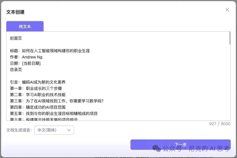 說(shuō)實(shí)話,做為一個(gè)理工男+程序員,每次 工作匯報(bào)、技術(shù)分享都讓尼克很頭大,倒不是因?yàn)楹ε轮v或者不會(huì)講,而是每次的 ppt 制作屬實(shí)難產(chǎn)~ 去年 AIGC 爆發(fā)后,尼克對(duì) AI+ppt充滿期待,直覺(jué)告訴我大模型的內(nèi)容整理能力和格式化能力配上 ppt 模版,這條線絕對(duì)走得通。 果然,最新的“訊飛智文”打通了最后一公里,可通過(guò)多種輸入源生成ppt。 好,光說(shuō)不練假把式,咱們實(shí)操走起。 第一步: 首先我們先準(zhǔn)備一份資料做為大的內(nèi)容源,這里我把吳恩達(dá)老師的《如何構(gòu)建你的 AI 生涯》做為樣本,一共41 頁(yè)的小書,內(nèi)容量尚可。