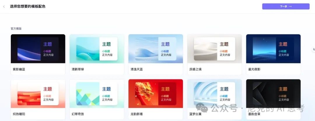 還不錯(cuò),與大綱的結(jié)構(gòu)對(duì)應(yīng)正確。 接下來(lái),我們進(jìn)入 ppt 生成環(huán)節(jié),這里訊飛智文自帶了十幾款模版,應(yīng)付些小分享應(yīng)該問(wèn)題不大,如果你對(duì) ppt 的樣式要求比較高,訊飛智文也可以自定義模版,我們可以自己導(dǎo)入一些合適的模版,這里就不過(guò)多贅述了。