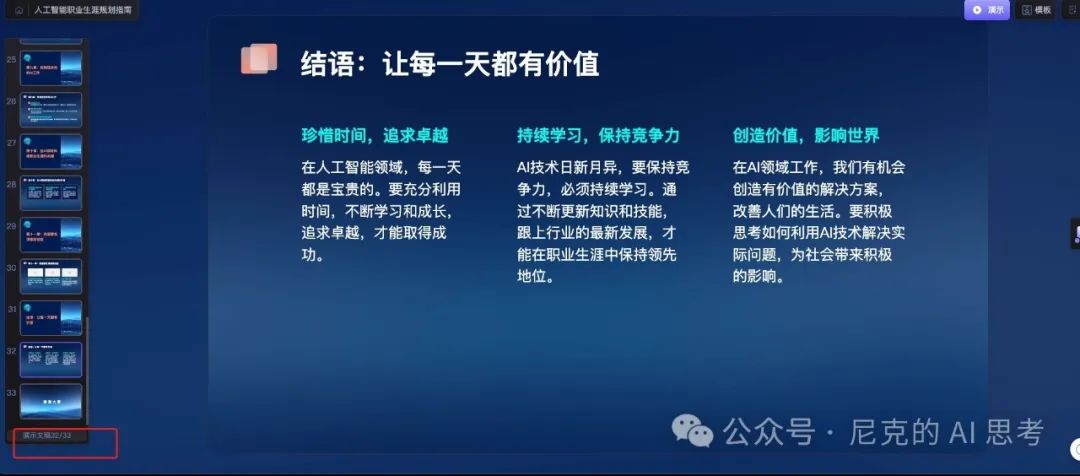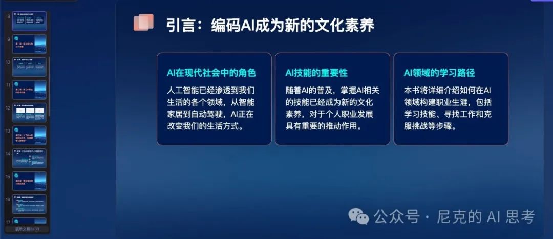 10 幾秒后,一版可用于分享 《如何構(gòu)建你的 AI 生涯》的 ppt 就生成了,我節(jié)選幾張給大家看下效果。