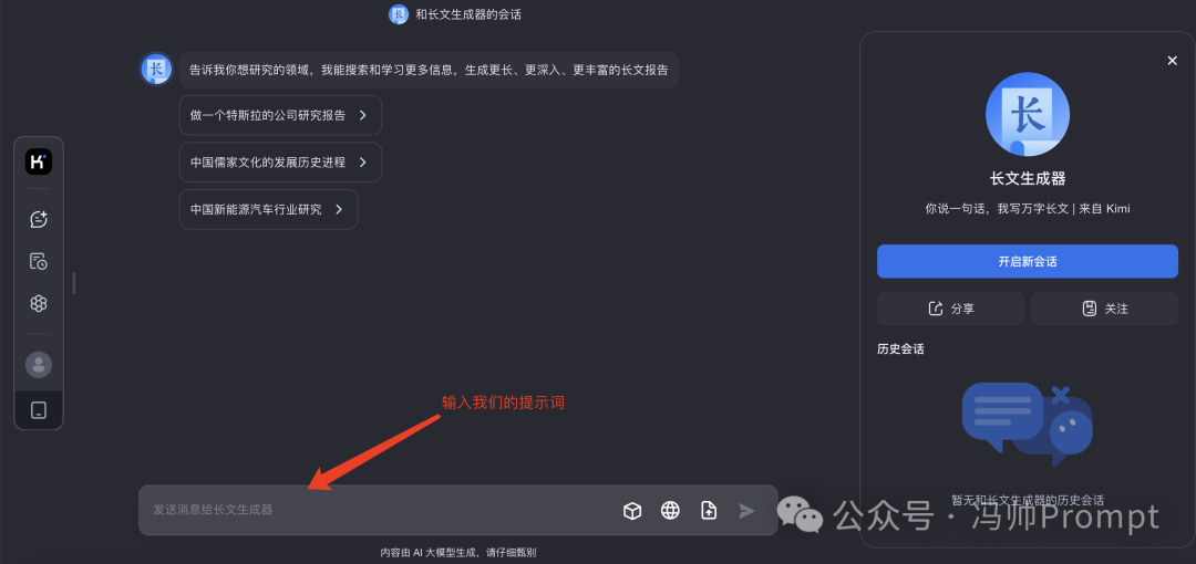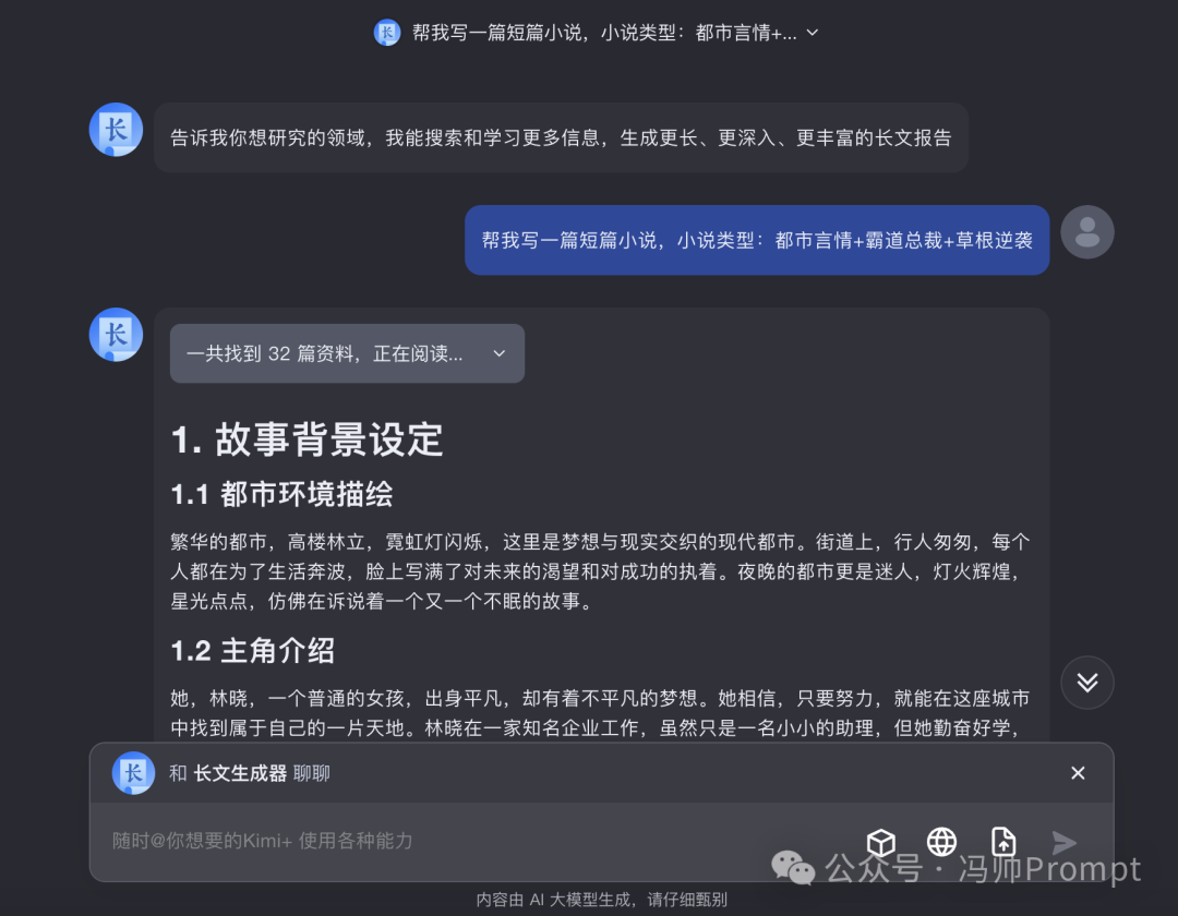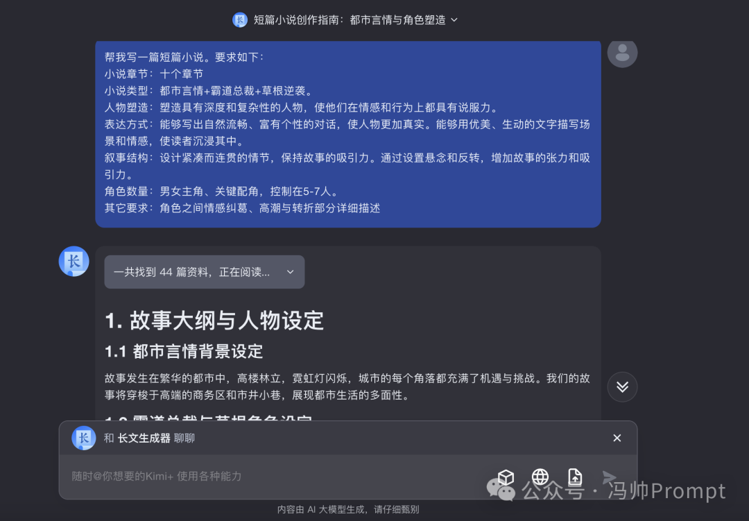 然后可能有人要問了,不是說一鍵生成萬字長文么?怎么就四千多字? 別著急,我們只用了一句簡單的提示詞就讓它生成了四千多字。接下來只需要優(yōu)化一下提示詞,就可以讓它生成更長的內(nèi)容了。 在提示詞中添加一些細節(jié)的說明,讓Kimi更好的完成任務,提示詞: