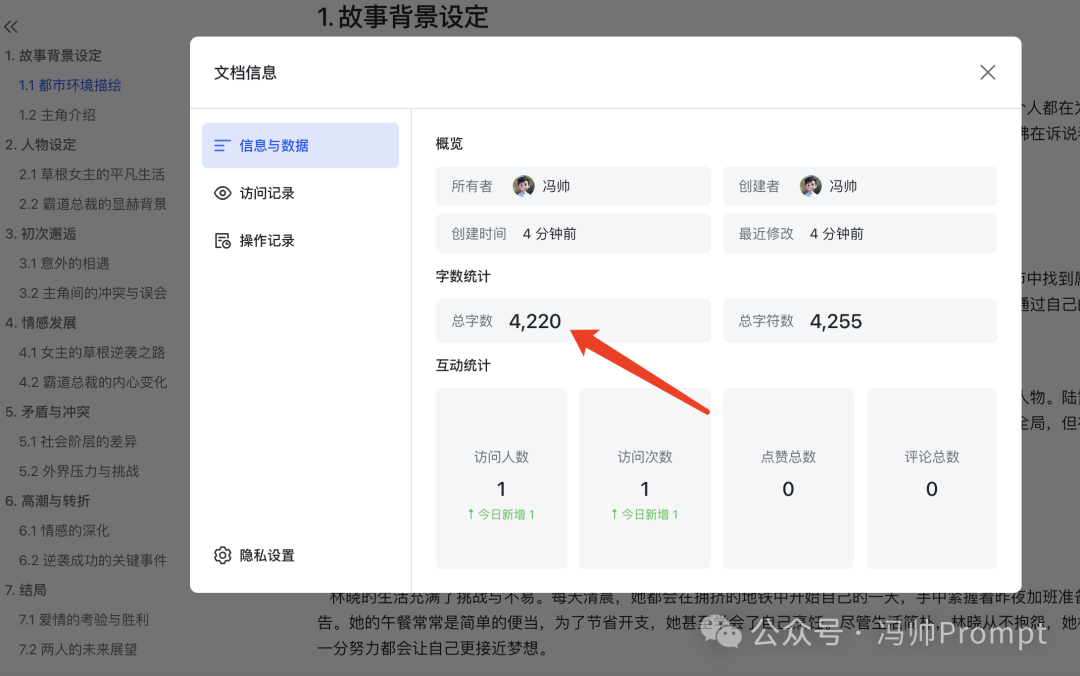 把生成的內(nèi)容復制到文檔中,好家伙,Kimi把小說的故事背景、主角介紹、人物設定都一一列了出來,并且還區(qū)分了大章節(jié)和小章節(jié)。