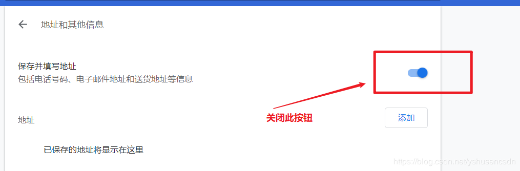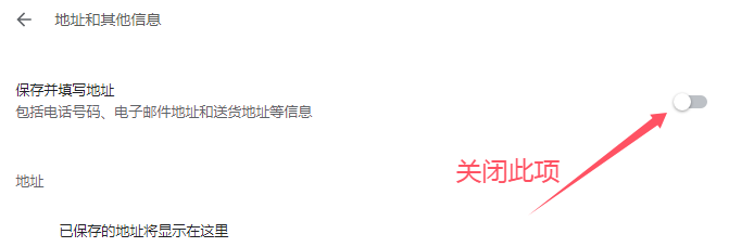 關(guān)閉“保存并填寫地址”即可。 早期版本的谷歌瀏覽器可能是以下界面: