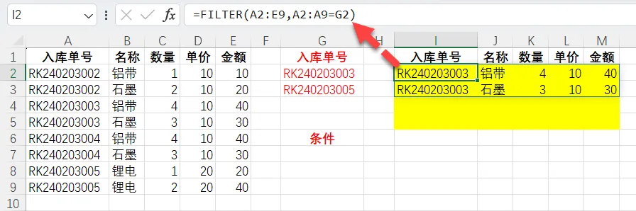 前2天的文章,提到用FILTER函數(shù)可以根據(jù)入庫單號將符合條件的內(nèi)容引用出來。不過這個公式,只能針對1個入庫單號,不允許多個入庫單號。