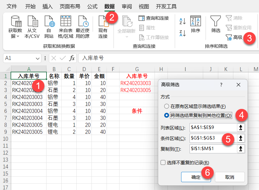 還有一個最簡單的方法,高級篩選。 選擇A1,點數(shù)據(jù),高級,選擇將篩選結(jié)果復(fù)制到其他位置,依次選擇列表區(qū)域、條件區(qū)域、復(fù)制到,確定。