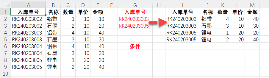 學(xué)員的問題,左邊是明細數(shù)據(jù),要將符合條件的多個入庫單號篩選出來,效果如右邊。