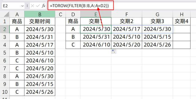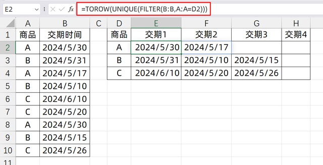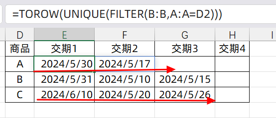 如果說我們要去重,顯示交期結(jié)果呢? 其實很簡單,只需要在FILTER公式外面套一個UNIQUE就可以了,它可以對去除重復(fù)的數(shù)據(jù),只保留唯一值,所以我們輸入的公式是: =TOROW(UNIQUE(FILTER(B:B,A:A=D2)))