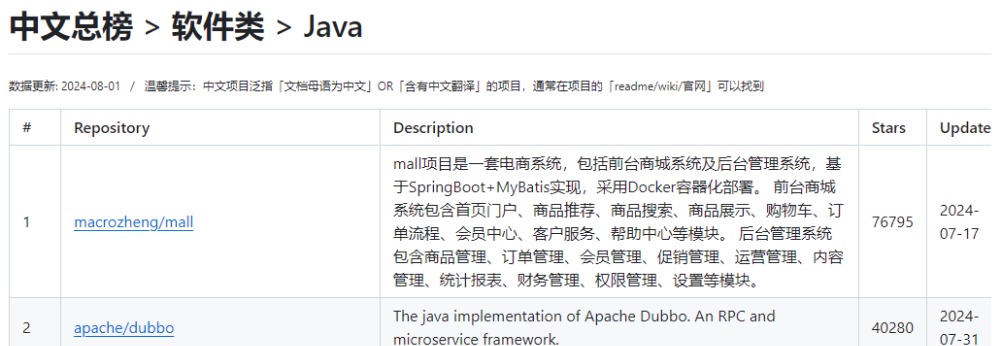 2.1 中文總排行榜 篩選出有中文文檔的項目進行排名,幫助大家更低門檻探索優(yōu)秀開源項目,打破語言障礙; 中文項目既包含國產(chǎn)好項目,也包含國外優(yōu)質(zhì)的含中文文檔的項目; 評選邏輯是保持活躍+總星數(shù); 2.2 中文增速榜 幫助大家發(fā)現(xiàn)增速較快的項目,優(yōu)秀不止于老項目; 評選邏輯是保持活躍+日均漲星數(shù); 2.3 中文新秀榜 幫助大家發(fā)現(xiàn)近一年的潛力新項目,后起之秀就在這里; 評選邏輯是保持活躍+近一年內(nèi)創(chuàng)建的較高星項目; 三、使用示例3.1 如何找優(yōu)秀的Java開源項目? ① 在中文總榜中找到軟件類下的Java