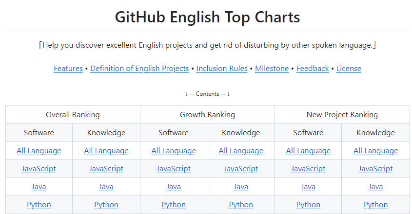 和中文排行榜一樣,GitHub英文排行榜 也有3個榜單