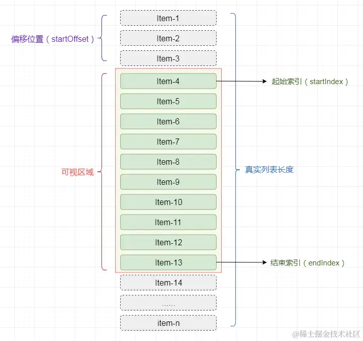 當滾動后,由于渲染區(qū)域相對于可視區(qū)域已經(jīng)發(fā)生了偏移,此時我需要獲取一個偏移量startOffset,通過樣式控制將渲染區(qū)域偏移至可視區(qū)域中。