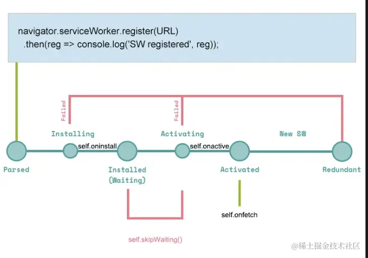 瀏覽器首先下載并解析編譯 Service Worker 的腳本文件。一旦解析和編譯成功,Service Worker 進(jìn)入安裝階段。在此階段,可以通過監(jiān)聽 install 事件來執(zhí)行初始化操作,例如預(yù)加載和緩存資源。